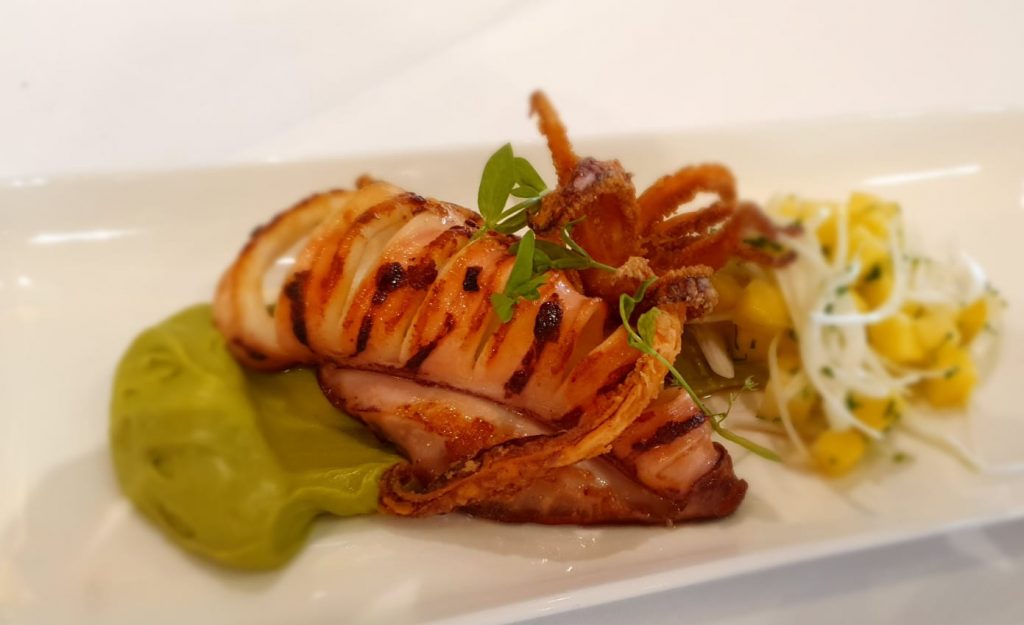 Calamar a la parrilla con crema de aguacate y mostaza