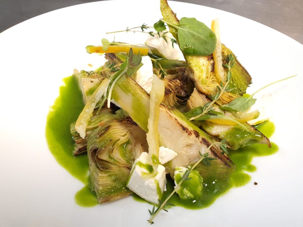 flor de alcachofa confitada con cremoso de queso, patata y bacon
