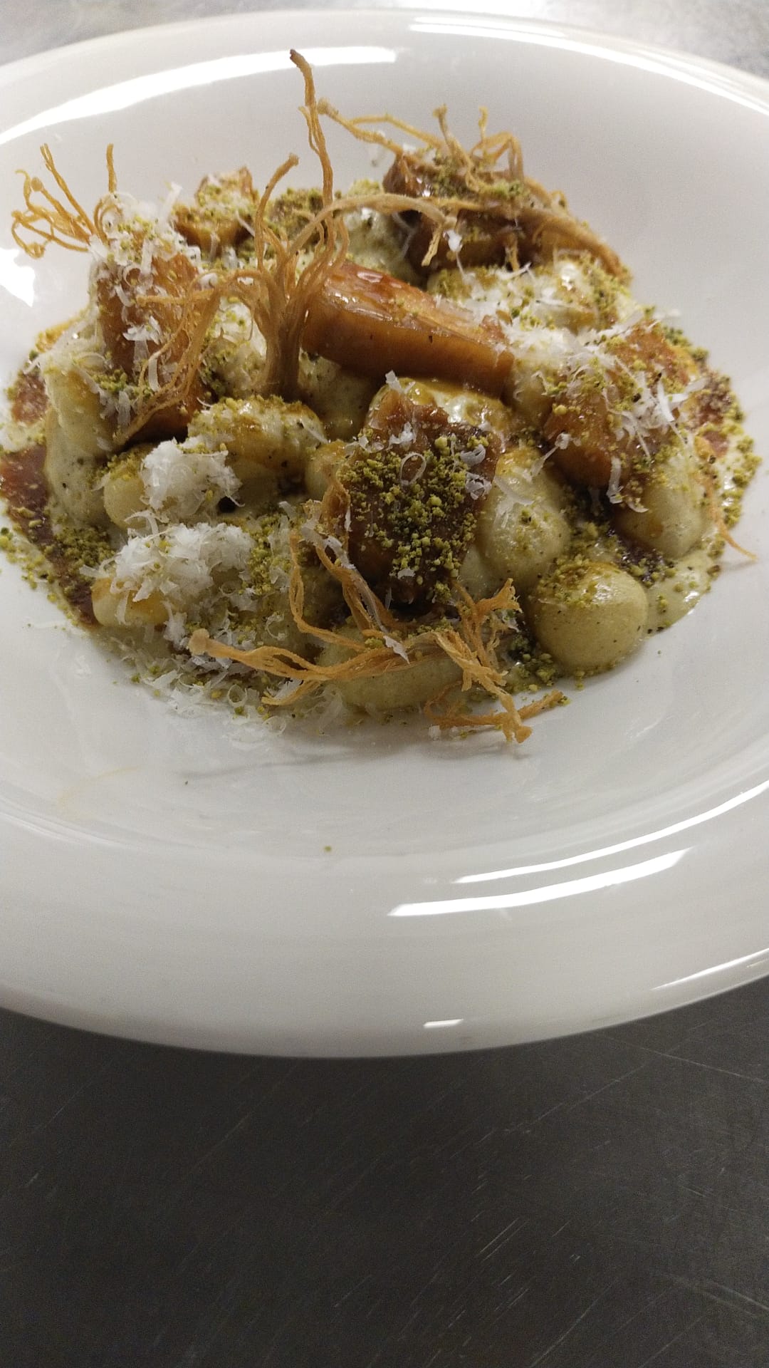 Gnocchis con pistacho, limon y panceta melosa