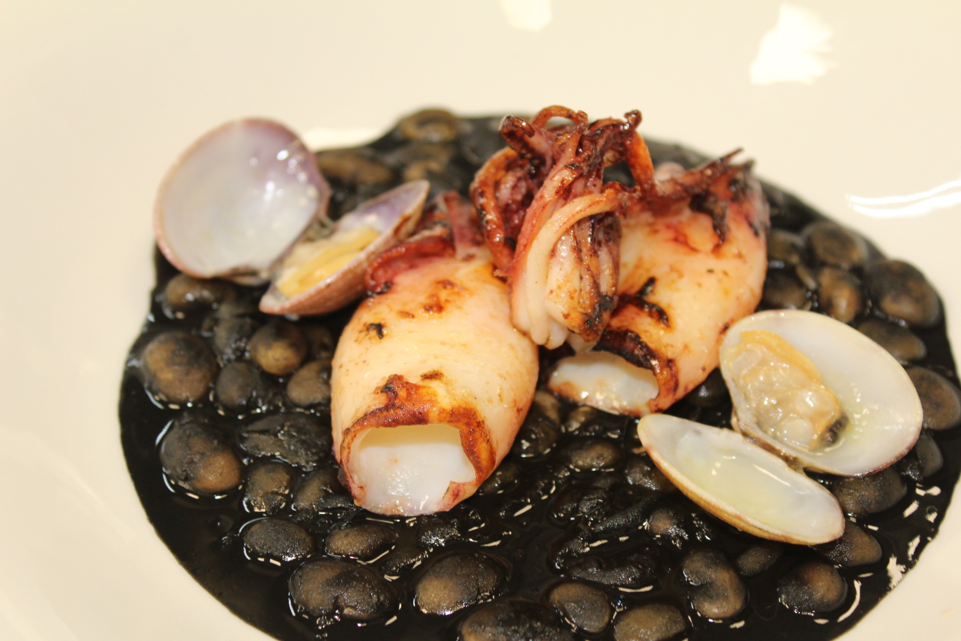 Pochas de navarra en salsa de tinta con txipirones y almeja japónica