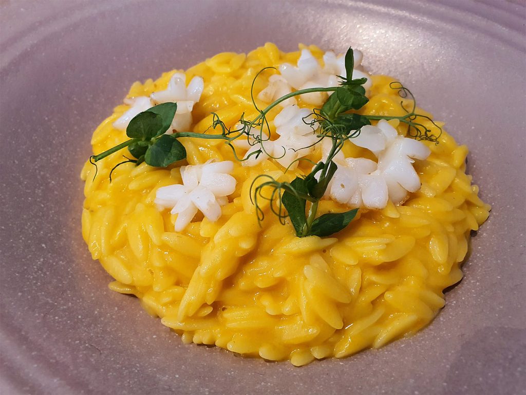 Risotto falso puntalete con crema de calabaza sepia a la plancha